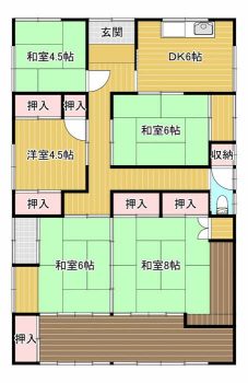 | 構造/間取り | 木造/5DK(和室4.5帖、和室6帖、和室6帖、和室8帖、洋室4.5帖) |