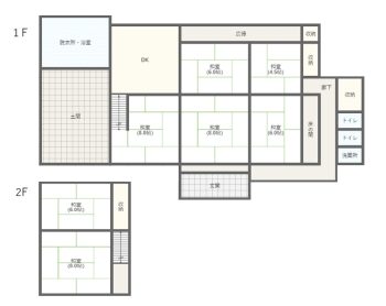 | 構造/間取り | 木造/7DK(1F 和室8帖X2、和室6帖X2, 和室4.5帖 2F 和室8帖。和室6帖) |